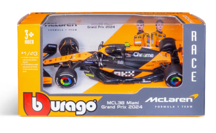 Showcasing the 2024 McLaren MCL38 driven by Lando Norris, this 1:43 scale diecast model features the bold design and performance of one of Formula 1's most exciting teams. Perfect for collectors, this model celebrates Norris' talent and McLaren's continued commitment to excellence in F1