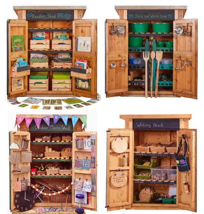 Maximize learning potential with our Curriculum Sheds - Set of 4. These four sheds – Outdoor Maths, Writing, Reading, and Sand & Water – revolutionize your EYFS setting by providing organized and secure storage for valuable educational resources. Each shed features blackboard-painted surfaces and lockable doors, promoting creativity, independence, and a passion for learning.