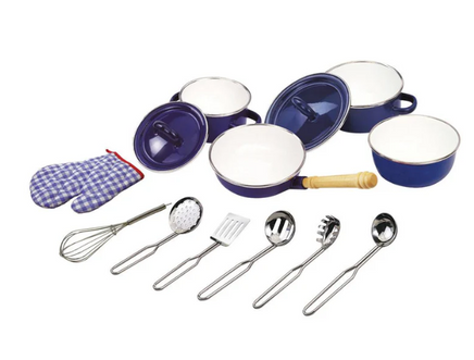 Young aspiring chefs will feel fully prepared with this extensive Kitchenware Set from Tidlo. This 13-piece collection includes four enamel coated pots and pans featuring a stylish blue design, six utensils, and an oven mitt. All items have been scaled down for ease of use by little hands, making it perfect for young chefs to whip up delicious meals. This set also serves as a valuable tool in teaching children about kitchen safety and healthy eating habits, especially when paired with Tidlo Play Food (sold separately). Encouraging creativity and imaginative play, it also aids in developing hand-eye coordination, fine motor skills, and dexterity. This set meets all current European safety standards and consists of 13 play pieces.