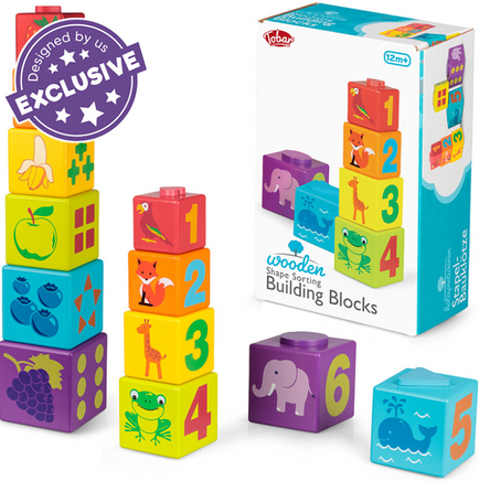 Set of six building blocks that stock on top of one another in size order. The shape on top and corresponding socket on the base of each cube means that the tower can only be stacked in one way. This helps develop basic coordination and problem solving skills. The images feature ordered numbers, as well as pictures of fruit and animals.