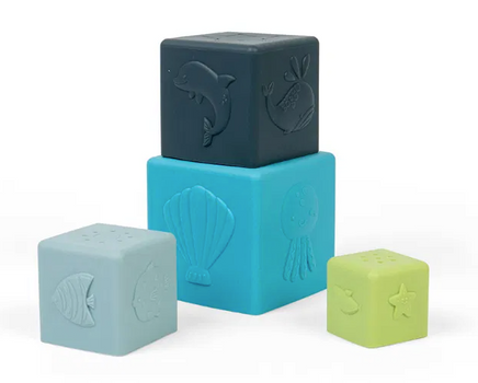 Sort them, stack them, and sprinkle water out of them! These Stacking Cubes are made from soft silicone and styled in seaside shades with friendly ocean creatures on each side. Three of the four cubes also feature small holes on the base, so water will trickle out as kiddies have fun sorting and stacking in the tub.