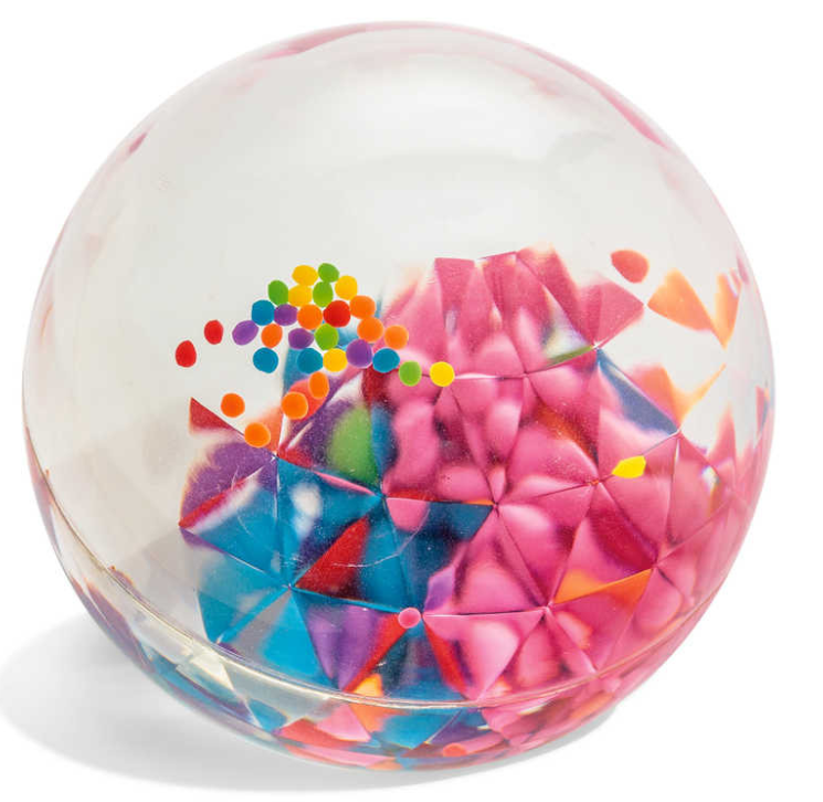 A large and jolly bouncy ball filled with multi-coloured beads suspended in clear liquid. When bounced or rolled from hand to hand, the beads eddy and swirl within the moving liquid to create enchanting torrents of colour. The kind of toy that just begs to be picked up and played with!