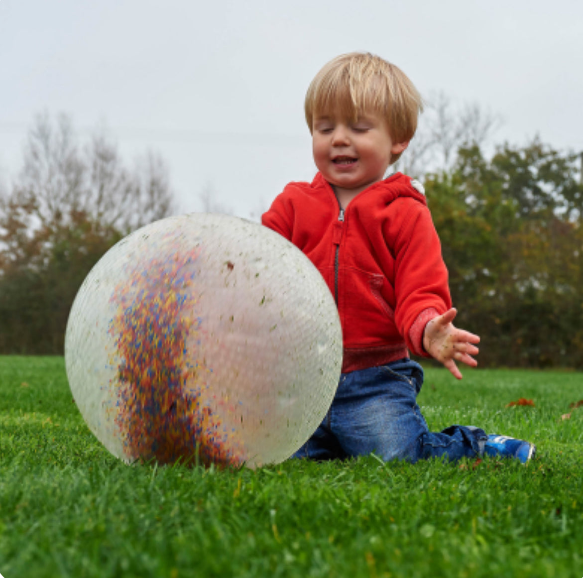 A large clear inflatable ball with a subtle textured surface, containing thousands of tiny colourful plastic beads which rattle and dance as the ball is pushed and rolled about. Ideal for gentle, controlled physical play where children can roll or pass the ball to each other.