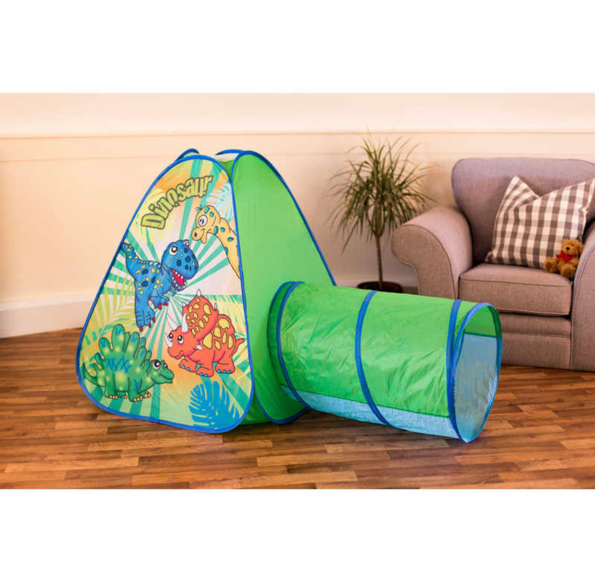 Dinosaur themed pop up play tent with a tunnel that leads into it. Simply remove it from the packaging and the tent takes shape, with canvas cover walls and a cylindrical tunnel instantly popping up into a rigid structure. It's covered with cheery dino designs and provides a fun space that's suitable for play both indoors and out in the garden.