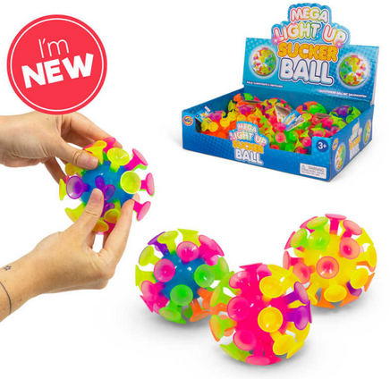 Experience the magic of our Mega Light Up Sucker Ball! Toss it against a wall and enjoy the vibrant light show as the lights flash on impact. With its soft, tactile design, this suction cup ball engages kids in sensory play, encouraging touch and visual stimulation. Perfect for bouncing and sticking to walls or windows, it promises giggles and endless entertainment for children everywhere. Approx 10cm.