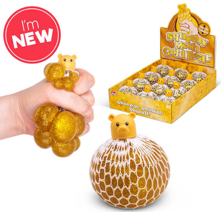 A rubber-like gel-filled ball that’s surrounded by a soft net mesh, and topped with a cute golden bear head. Give the ball a squeeze and it will bulge through the netting, causing a series of squishy balls to appear that have colourful slithers of confetti within them.