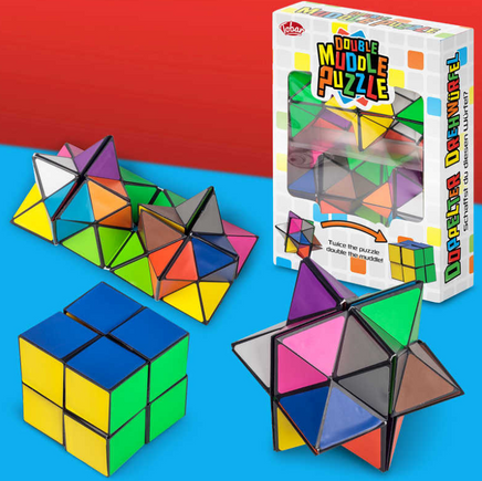 Set of two geometric shapes that flip and fold together to make a cube. This item is unlike any other shape puzzle we've ever seen, with the two pieces able to twist and flip in a range of unique ways. The two parts combine to form a two by two cube with coloured faces that resemble a classic puzzle cube.