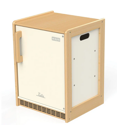 Aspiring young chefs can easily store their make-believe food, including Tidlo's Meat and Fish or Dairy and Eggs, in this bright wooden Fridge. The device boasts vent details, storage shelves, and a simple-to-open door. Its solid structure and magnetic stopper ensure that the door always closes tightly, keeping the food inside fresh. This Fridge is an ideal tool to educate kids about the items that belong in the fridge and their purposes. It also includes convenient carrying handles and encourages imaginative play. Pair it with other Tidlo kitchen appliances to create a complete play kitchen. Minimal adult assembly required. Crafted from responsibly sourced, high-quality materials. Meets current safety standards in Europe.