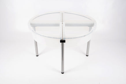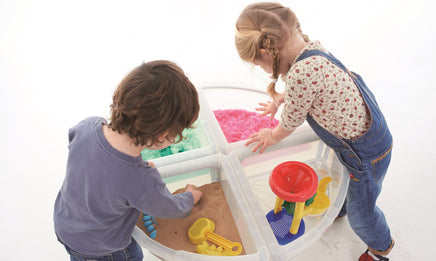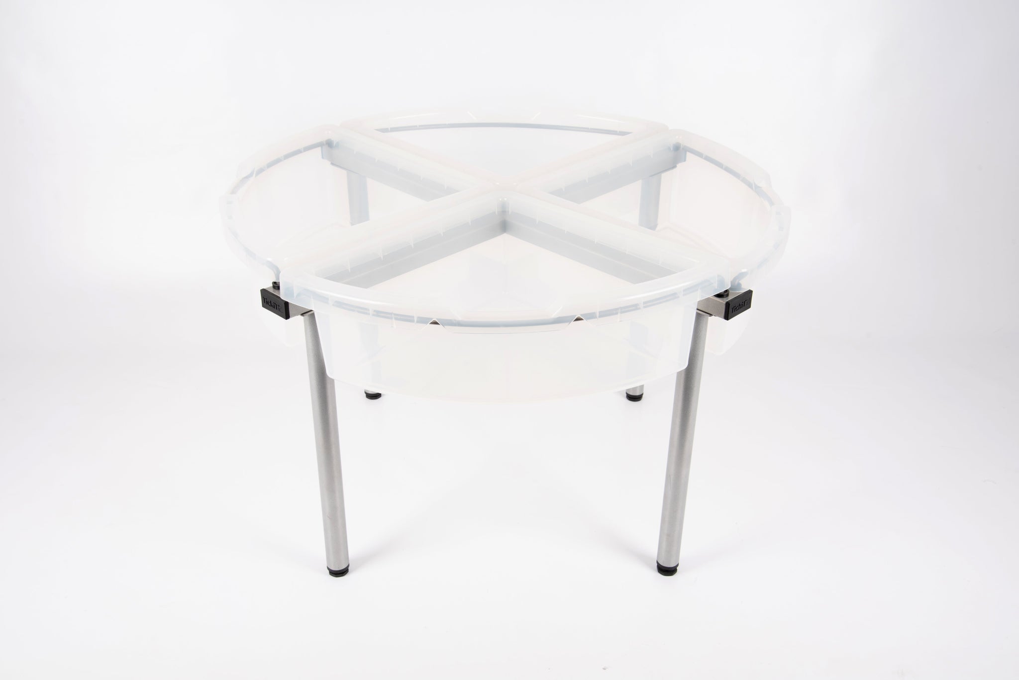 4 clear quadrant trays with a grey metal stand forming a sturdy activity circle. The legs have micro-adjusters in the feet for use on uneven surfaces. Children can play and discover the properties of sand, water, confetti, wood chippings or whatever medium you decide to place into the handy sized trays which are easy to manage, clean, lift and empty. Ideal for encouraging collaborative group play.