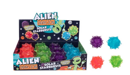 Entertain your little ones with the Flashing Solar Starbursts. Everyone can have great fun bouncing and playing catch with these out of the world inspired spiky balls. With 4 colours to collect, the starbursts will encourage sensory play as well as strengthening dexterity and hand eye coordination. Suitable for ages 3 years+