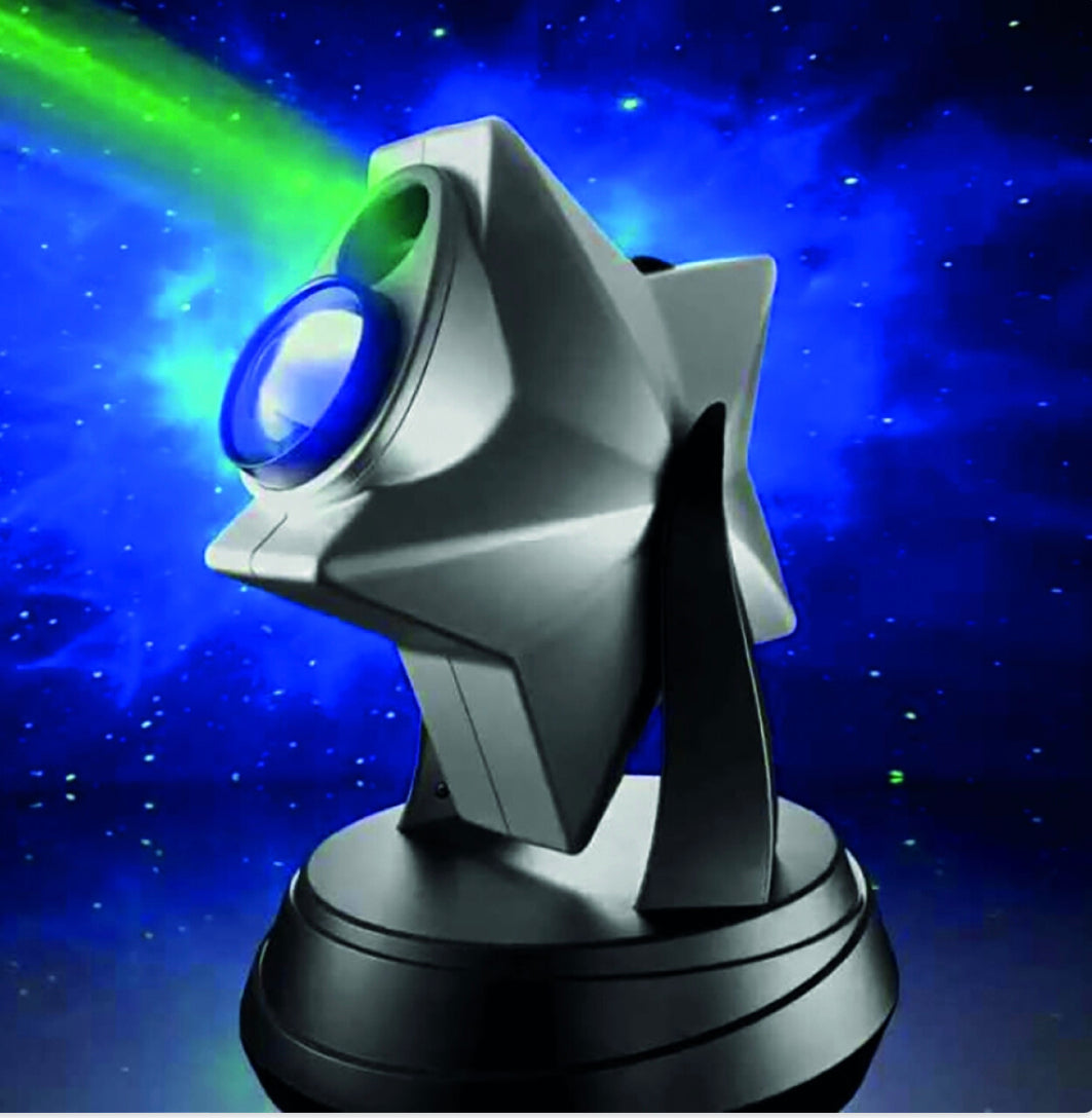 Imagine having your very own Planetarium at the flick of a switch! This star-shaped lamp can be adjusted to any angle and illuminates any size room projecting galaxies with thousands of twinkling stars, some appearing closer than others, occasional shooting stars and clouds. The varying brightness creates the illusion of close stars and distant stars from far-away galaxies. The Laser Stars Projector creates green stars, rather than yellow or white, because the colour green is widely recognised as having a calming effect. The Projector can be used to help soothe sensory overload by creating a tranquil atmosphere that promotes a sense of wellbeing. This effect can be particularly beneficial for those with Autism Spectrum Disorders. The Projector is self-focusing and features a cloud brightness control. Comes with built-in-key-hole slots for optional wall mounting. For best results use in total darkness.